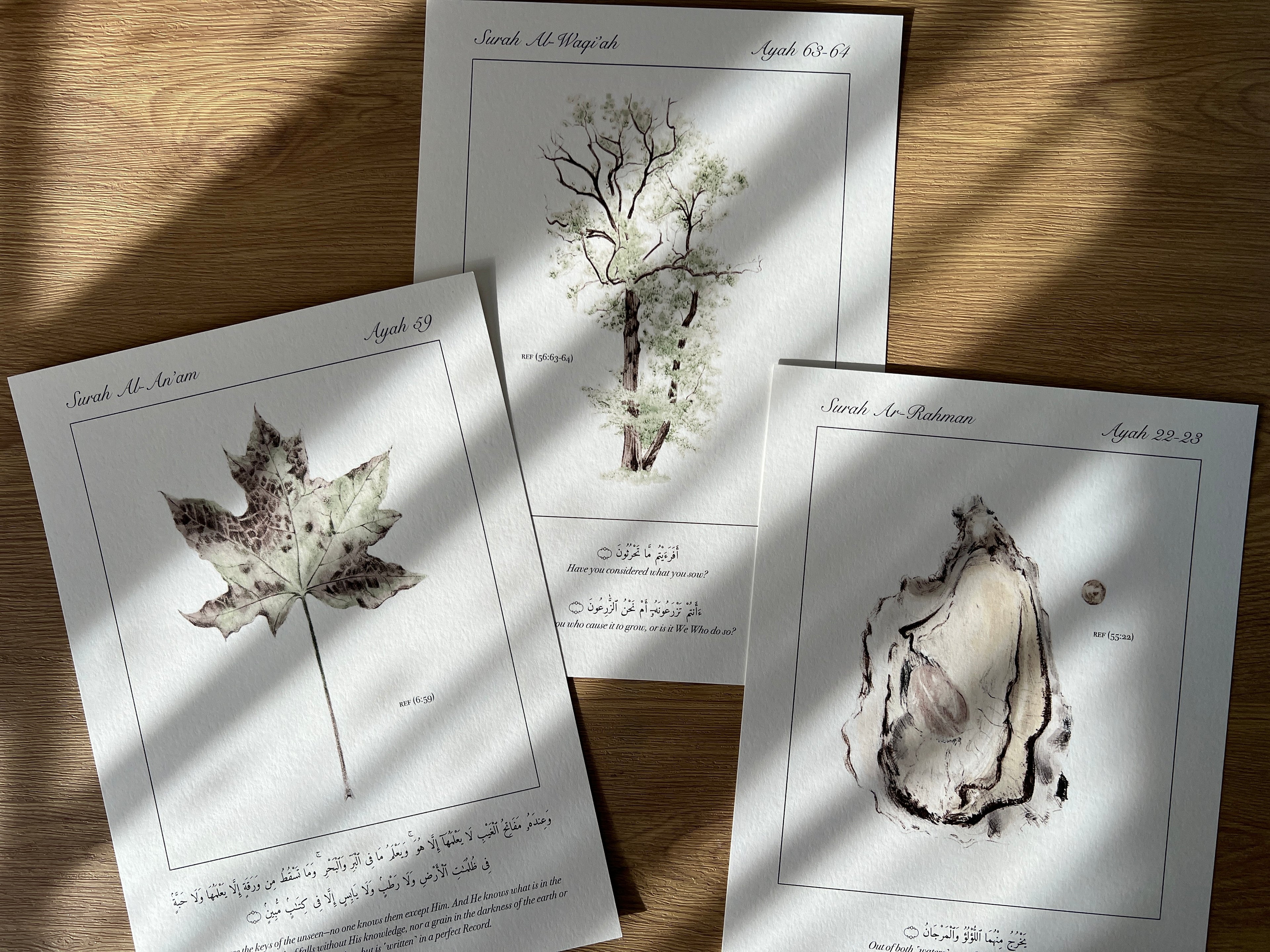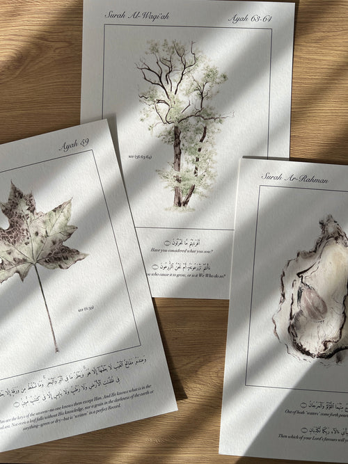 each print was designed and hand drawn with a specific verse of the Quran in mind